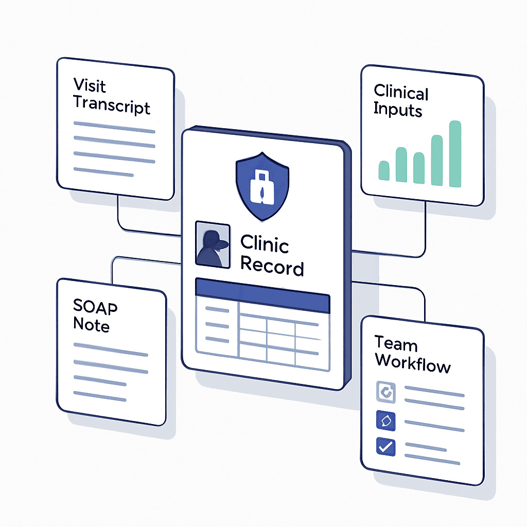 Клинични бележки, входни данни и SOAP документация в едно споделено пространство—всяка роля разполага с нужната информация без да се налага да пита.