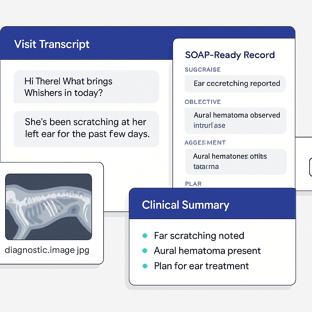 It helps veterinary teams turn clinical conversations, exam details, and other inputs into a structured clinical record. The goal is to make documentation faster, clearer, and easier to review than scattered notes and attachments.